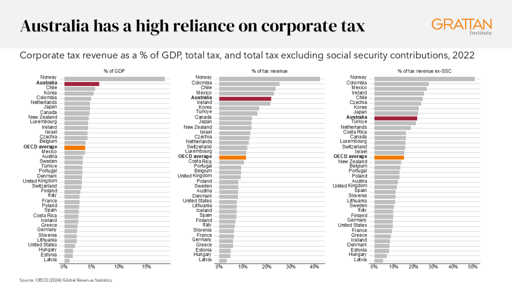- Our total corporate tax take is high relative to our peers – in part artificially because of dividend imputation, and because we have a resources economy that can generate excess profits when commodity prices are high.8Stewart (2019); PBO (2024); Minifie et al (2017, p. 31).