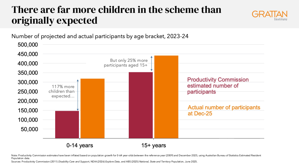When the Productivity Commission first proposed the NDIS in 2011, it estimated how many adults and children would be supported by the scheme. Today, the number of adults on the NDIS is only slightly higher than that original estimate. The number of children, however, is more than double.
